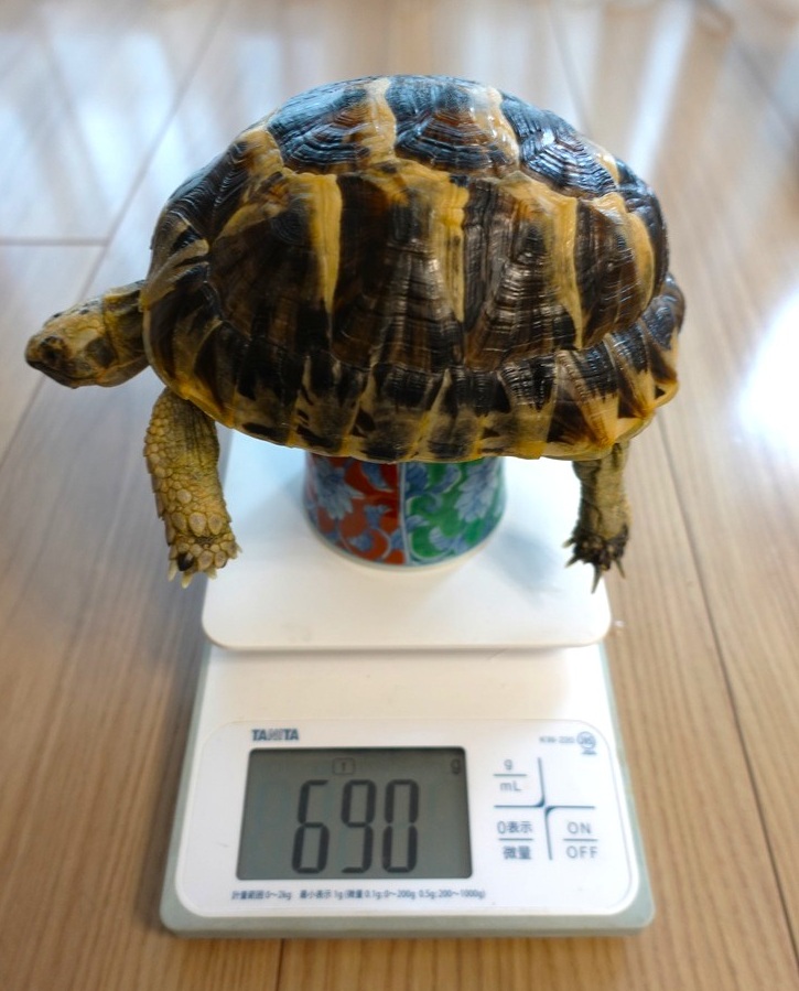 さてこちらは2023年の5月から院長が飼育しているギリシャリクガメのだんごさん、お迎えした時はピンポン玉サイズでしたが、2年半で育ってくれました。1年前の体重が560gくらいでしたので、2割くらい大きくなった様子です。